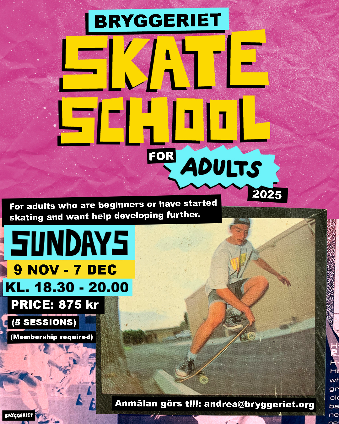 Vi är mitt i terminen och våra grupper med Bryggeriet Skate School är i full gång. Nu öppnar vi upp anmälan till nästa omgång som startar efter höstlovet. Som vanligt kommer vi köra två grupper på torsdagar indelade efter nivå för barn mellan 6-15 år, men vi kommer även ha en grupp för vuxna på söndagar.