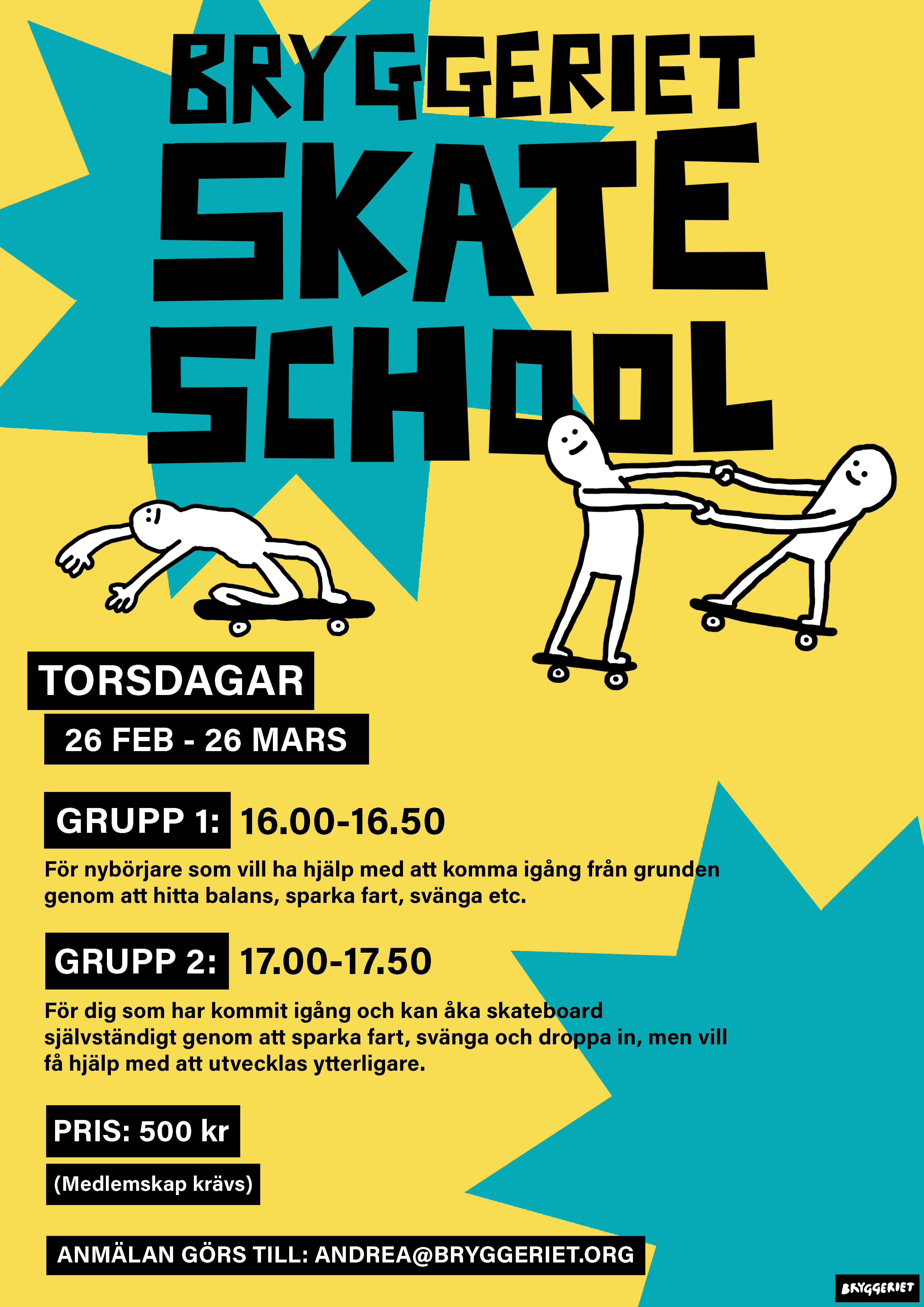 Anmälan görs till: andrea@bryggeriet.org (Skriv namn, ålder, samt vilken grupp ni önskar anmäla er till.)