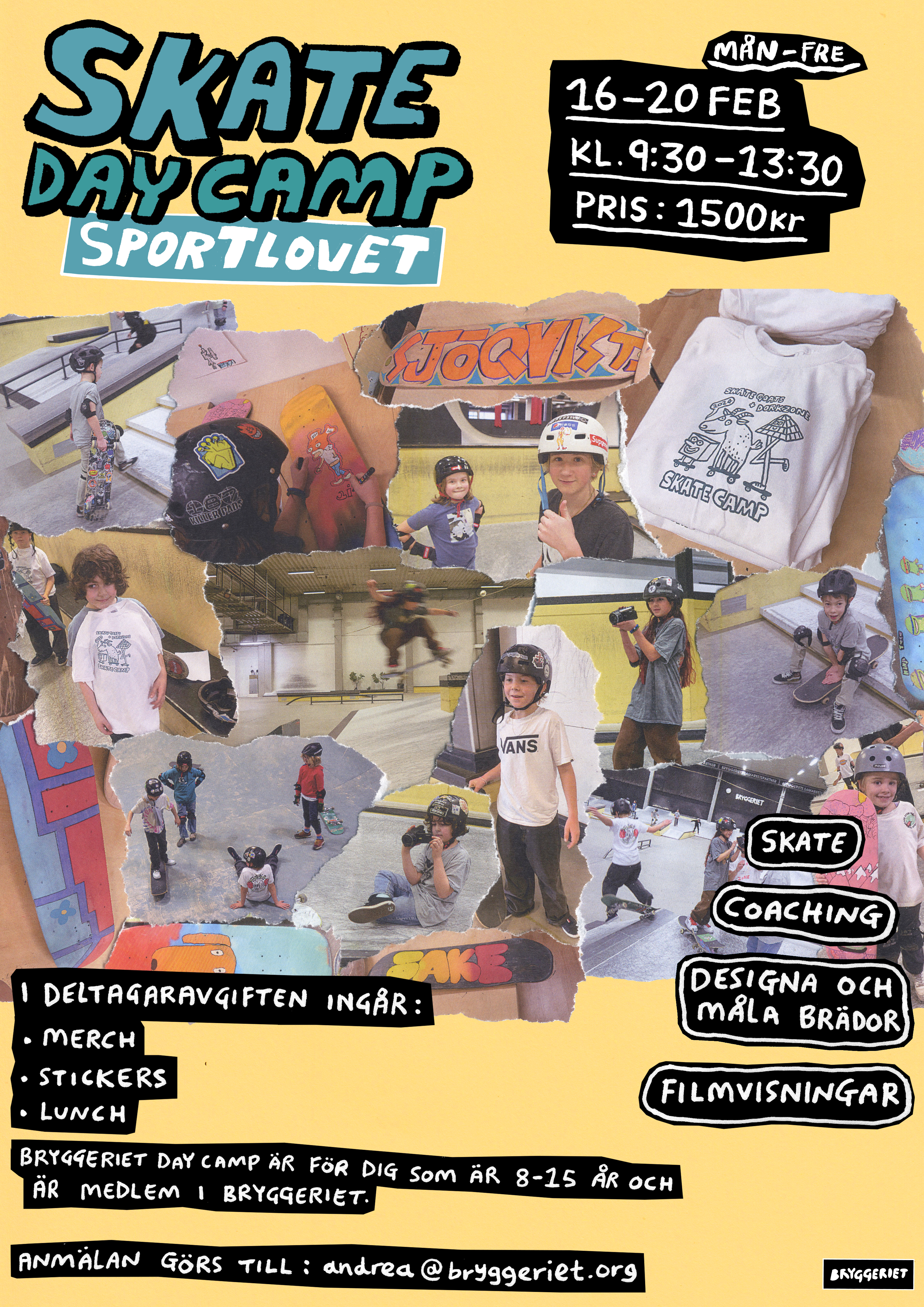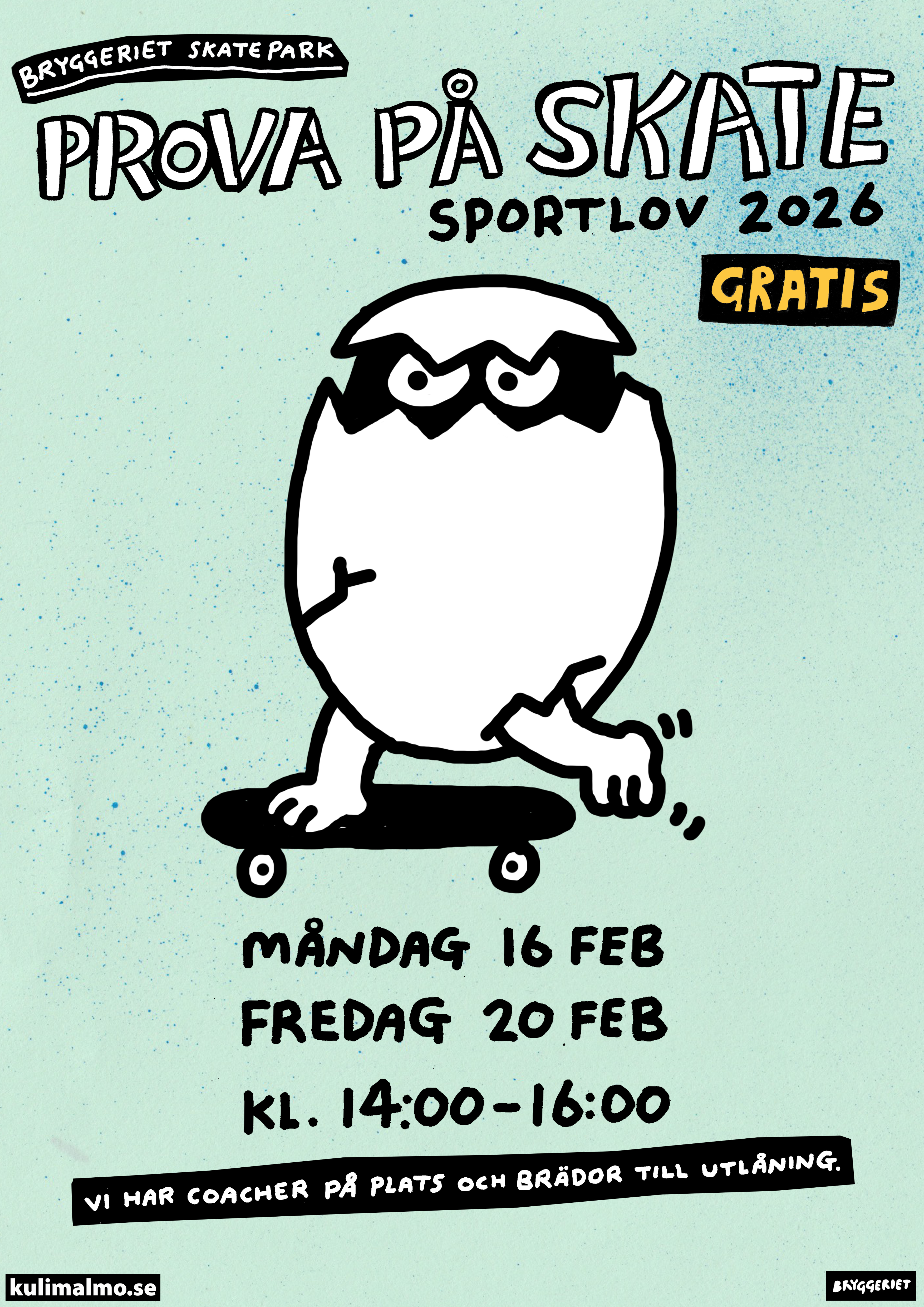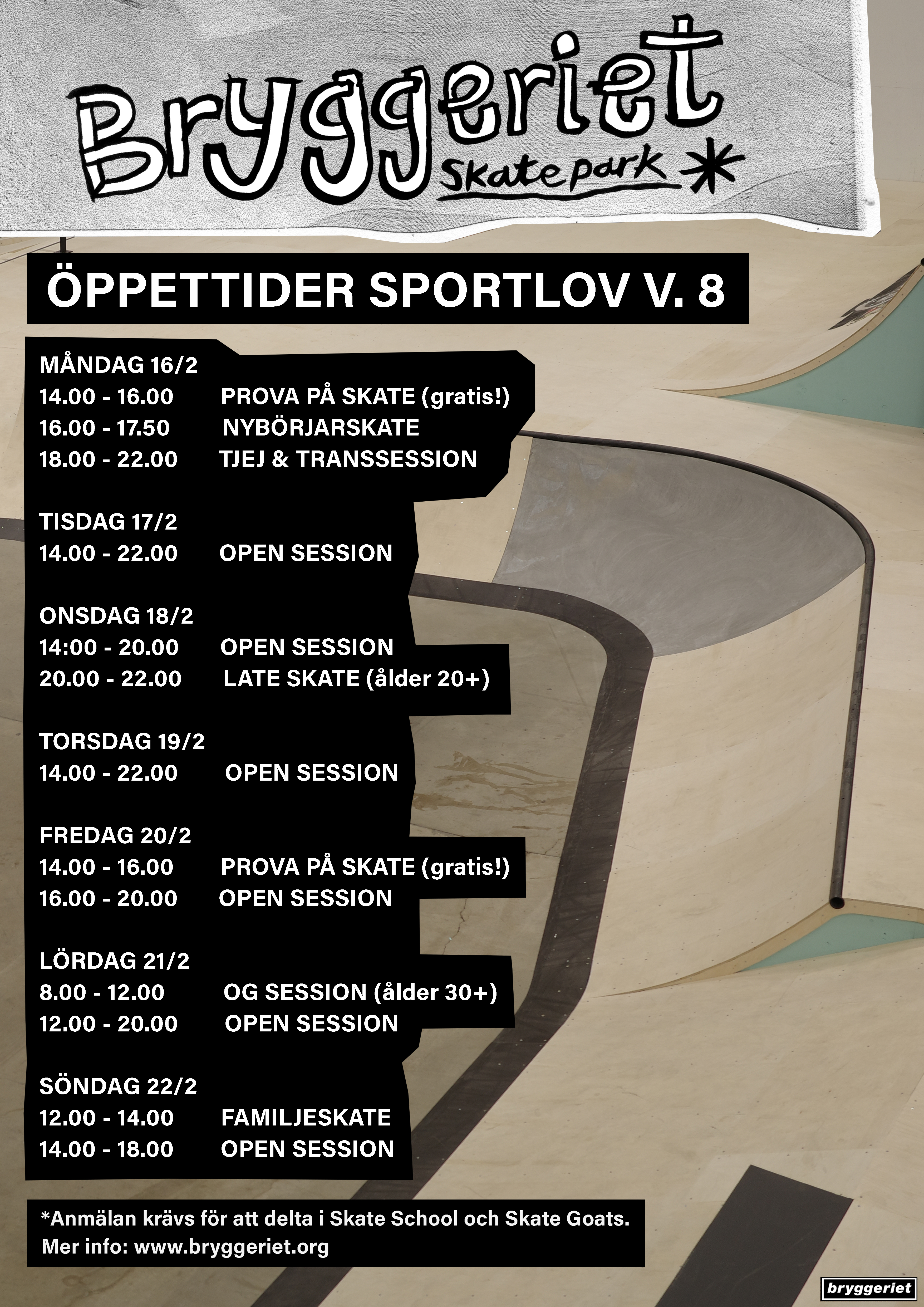 Snart vankas det sportlov i Malmö och på Bryggeriet har vi som vanligt ett fullspäckat schema. Det finns några platser kvar för dig mellan 8-15 år som vill delta i Bryggeriet Skate Day Camp (mån-fre kl. 9.30-13.30) och vi kommer även ha gratis prova på skate för dig som inte har åkt skateboard tidigare. Tis-tors startar våra open sessions kl. 14.00 och i övrigt är öppettiderna sig likt. Se fullständigt program här: